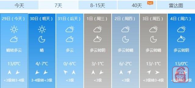 12月30日(星期一):晴天间多云,东北风4-5级 -1-5℃