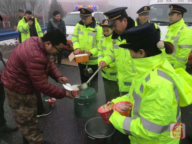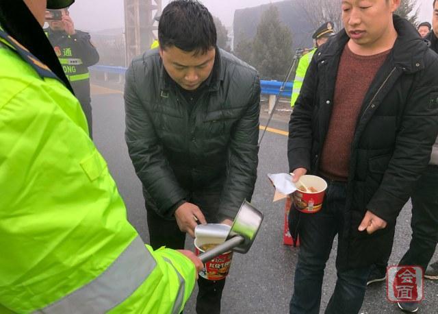 当滞留群众接过方便面、火腿肠,吃上热饭的时候,司机张先生满怀感激地说:“在路上堵了这么长时间,又冷又饿,这下好了,能吃上热腾腾的面,太感谢你们了,谢谢啊!”