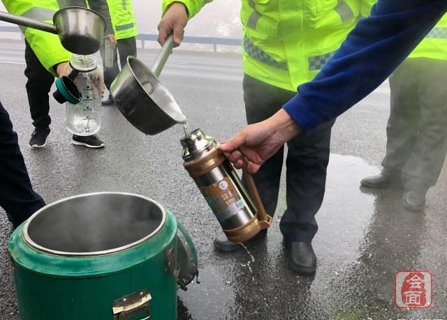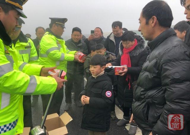 1月9日,受大雾影响,为保证司乘人员有饭吃、有水喝,河南省高速公路发展有限公司安新分公司组织路产大队当班队员到豫冀省界为被困司乘人员送去方便面、火腿肠和开水等冬日温暖应急物资,并安排队员对滞留司乘人员做好封路解释工作。