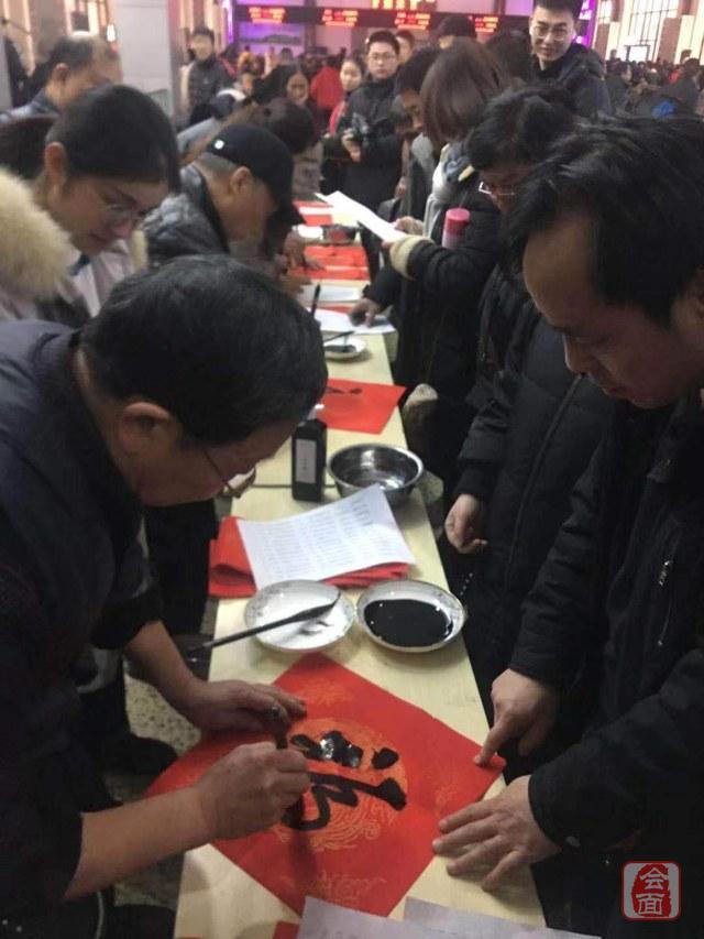 上午,郑州火车站人流如织,不少旅客行色匆匆,赶着回家过年,郑州铁路局集团公司文联书法爱好者在候车厅为旅客现场写春联、送“福”字。旅客们根据各自需求,拿到“私人定制”新春祝福。
