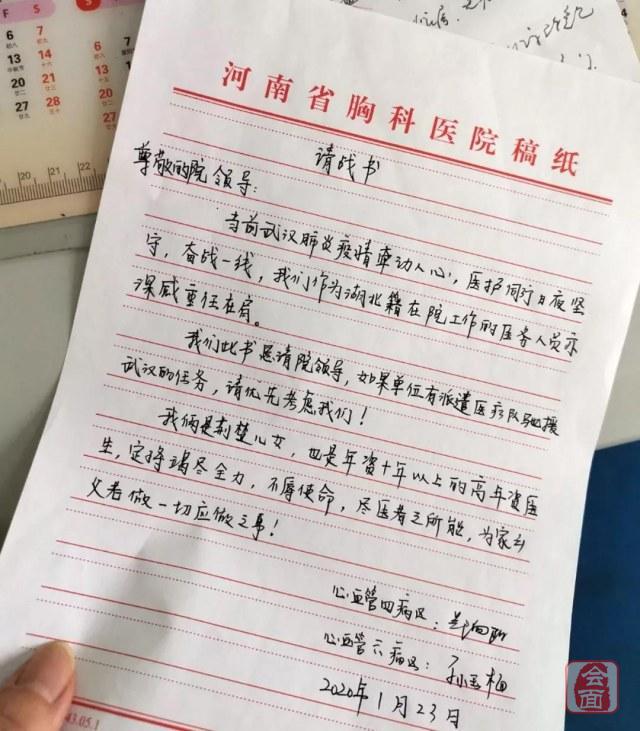 1月23日下午,河南省胸科医院医生孙玉梅和郑向阳一起来到医院办公室,向单位递交了一份“请战书”,自愿要求前往武汉,驰援抗击新型冠状病毒感染肺炎疫情一线。