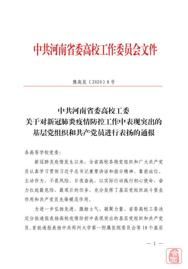 中共河南省委高校工委今天对新冠肺炎疫情防控工作中表现突出的基层党组织和共产党员进行通报表扬,首批通报表扬中共郑州大学第一附属医院委员会等18个基层党组织和赵松等31名共产党员。