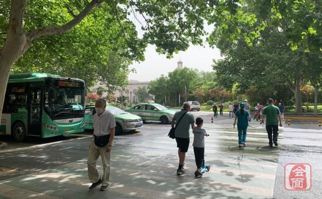 在嵩山路互助路交叉口的斑马线旁,周女士和孙子手拉手走到了路边,来往车辆及时地进行减速停车,周女士便拉着孙子快速通过了路口,她们二人还时不时地向车主们点头微笑,“真好,给我们一让,非常暖人心。人家既然礼让你了,你也得抓紧时间赶快过了,要不然会耽误别人的时间,礼让是相互的。这种礼让的行为也会给孩子做个榜样,我们刚跑过来的时候,孩子就在主动地大喊谢谢。”