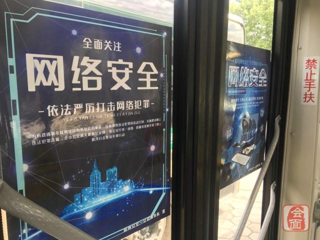 走进车厢,清新蓝色的主色调让人感觉十分清爽。共建网络信息安全、文明网络、网络安全审查办法......不论是车窗上,还是后车门玻璃都张贴着这些关于网络安全的宣传海报,整个车厢内弥漫着浓浓的科普氛围。