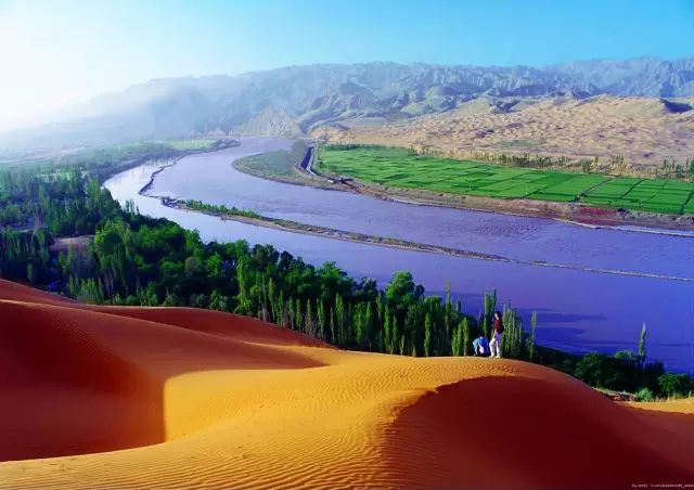沙坡头,位于宁夏中卫市,黄河第一入川口,黄河横穿而过,在沙与河之间,是一片郁郁葱葱、滴翠流红的古朴园林。