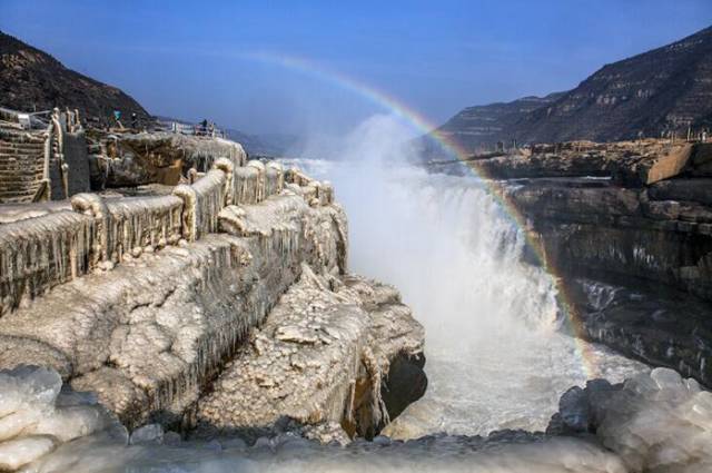 壶口瀑布是中国第二大瀑布,世界上最大的黄色瀑布。在水量大的夏季,壶口瀑布气势恢宏;而到了冬季,整个水面全部冰冻,结出罕见的巨大冰瀑。
