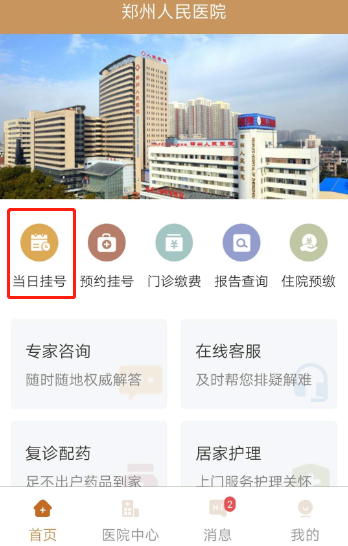 【操作方法】:首页点击当日挂号或预约挂号→选择科室/医生→选择就诊时间/就诊人→提交挂号申请→在线支付→完成挂号。