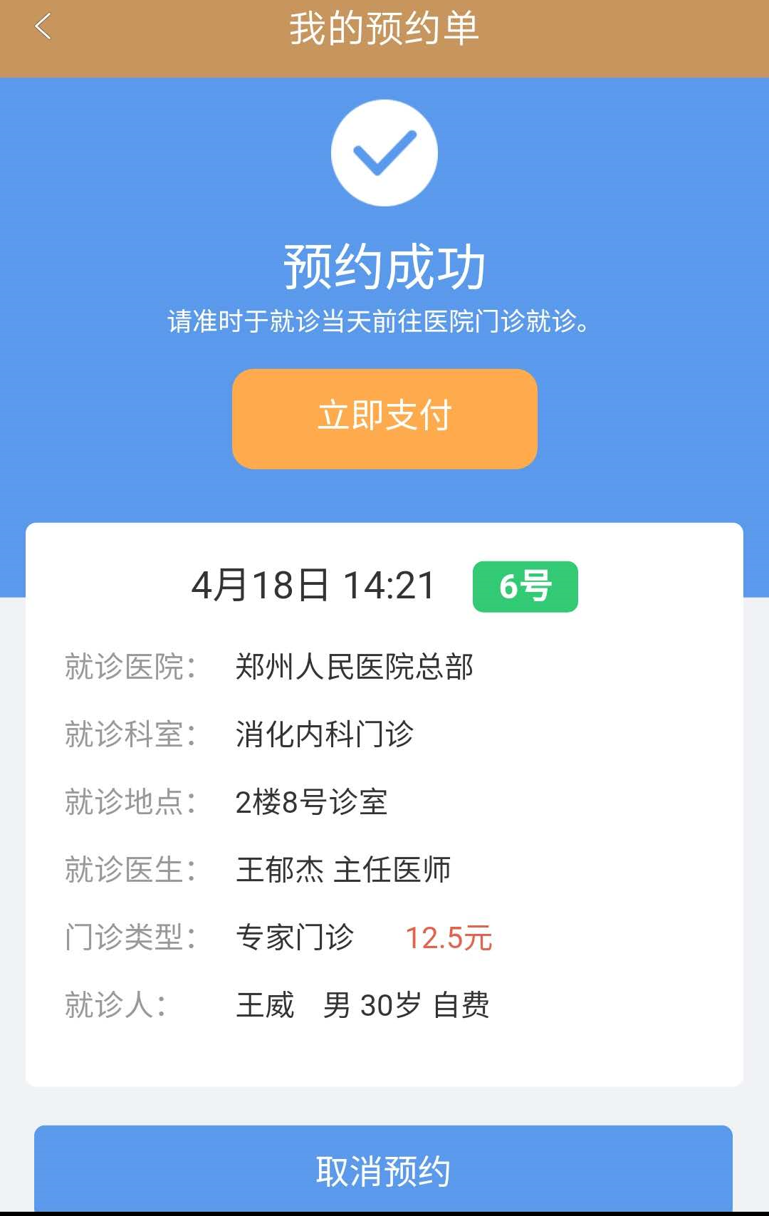 未就诊前,可随时取消预约挂号,费用将原路退回。