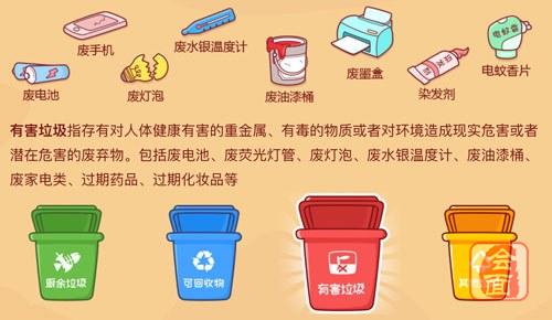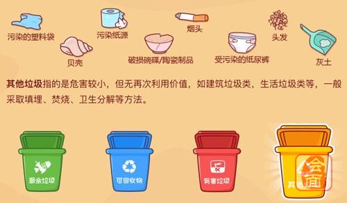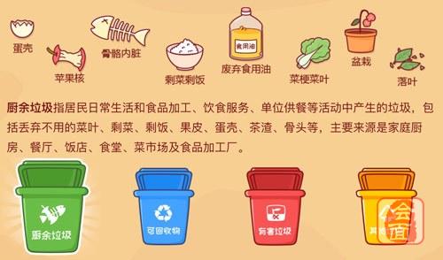 对此情况,征求意见稿对四种生活垃圾进行了细分明确。在生活垃圾中,可回收物包括废弃的纸张、塑料、金属、纺织物、电器电子产品等适宜回收和资源利用的物质;厨余垃圾包括废弃的剩菜、剩饭、瓜果皮核、蛋壳、畜禽产品内脏等在日常生活中产生的易腐性垃圾;有害垃圾包括废弃的电池,荧光灯管,温度计,药品、溶剂及其包装物,杀虫剂、消毒剂、胶片、相纸以及农药包装等对人体健康或者自然环境造成直接或者潜在危害的生活垃圾;其他垃圾包括除有害垃圾、厨余垃圾、可回收物以外的生活垃圾。