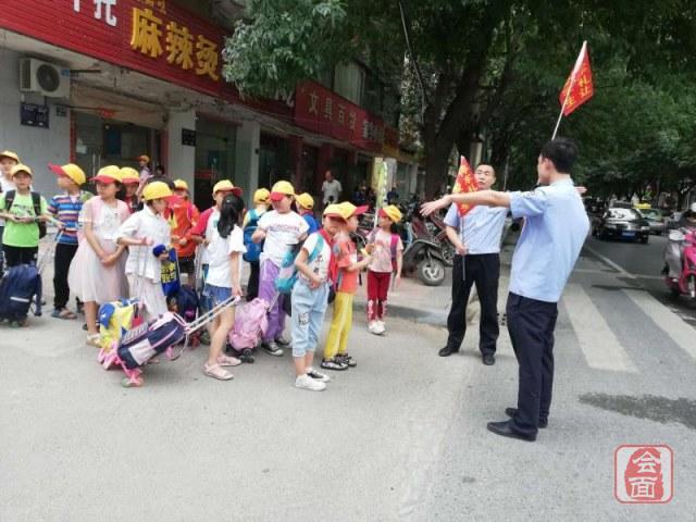 为做好护校安园活动,确保小学生在每天的上、下学期间的安全,治安管理服务大队二中队民警长期坚持在辖区建立了9个护校点每日早、中、晚上下学高峰时段,由民警、辅警组成的“护校队”准时在校园门口开展安全保卫护校工作并利用中午课间时间不但给孩子们普及防火、防电、防溺水及火灾自救小常识,课后又守护在小学门口手持醒目红旗,引导学生们安全的通过马路。