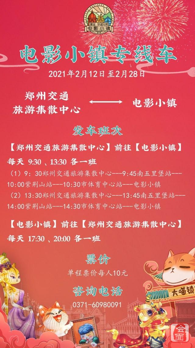 为更好地服务春节期间百姓出行,满足市民朋友对建业电影小镇一日游的需求,从2月12号(大年初一)开始,郑州交通旅游集散中心与郑州建业华谊兄弟电影小镇合作推出了郑州建业电影小镇大巴旅游直通车,车型采用54座宇通豪华大巴,每天两班,单程票价10元,逢节假日及景区主题活动可根据客流情况适时增发班次。
