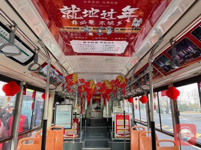 上午10点,一辆挂着国旗、红灯笼的“此心安处是吾乡”主题车厢停靠在经开中心广场站公交站点,乘客在公交志愿者的引导下有序乘车。