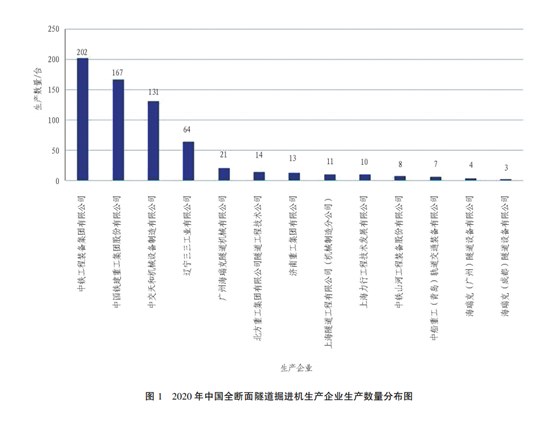 国家级核心期刊《隧道建设(中英文)》2021年发布的《中国全断面隧道掘进机制造行业 2020 年度数据统计》显示,2020 年,中国共生产全断面隧道掘进机 655 台,销售额累计约 209. 5 亿元。其中,全断面隧道掘进机生产数量最多的为中铁工程装备集团有限公司(202 台), 销售额最多的企业为中铁工程装备集团有限公司(约 81 亿元)。