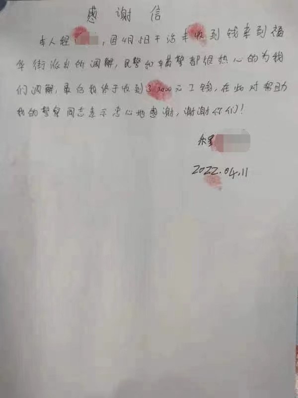 转眼3天过去了,辅警张航电话回访了两位当事人。徐某称已收到了退款,并已再次支付给了程某,程某也表示收到了工钱,在电话里他连连道谢:“谢谢你们啊!警察同志,要不是你们我这活就白干了,实在太感谢了!”4月11日晚上7时许,程某在收工后也专门赶到派出所向民警表达谢意。