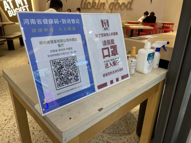 在中原万达广场内的某家餐饮店门前,工作人员正在引导进店市民扫场所码,记者看到,店门前摆放的桌子上除了有场所码,还有“请佩戴口罩”的提示牌以及酒精消毒液,工作人员孙女士,“从营业开始到营业结束都会安排专人在店门口引导顾客扫我们的场所码,出现绿码的话就邀请顾客进店,如果出现黄码或红码会立刻报给商场、办事处。”