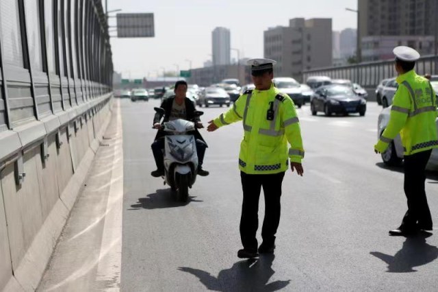 交警铁骑加大重点路段的巡逻密度和频次,及时发现电动自行车不戴头盔、不系安全带的交通违法行为,通过喊话提示劝导、现场纠正劝导等方式,最大限度扩大路段管控的覆盖面。
