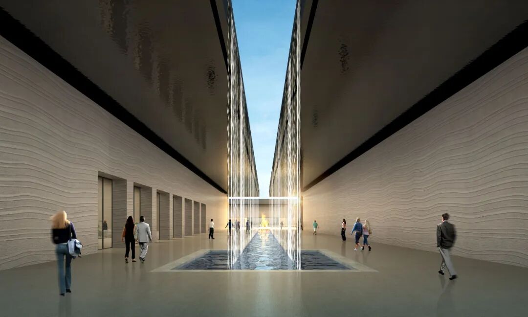 为再现先民的“诗与远方”,营造回归自然的氛围,博物馆还设计了4面共计180余米长的水幕墙,将成为河南省最长的室外水幕墙,这种设计元素在国内场馆设计建设中也比较少见。朱文巍介绍,水流自8米高的墙顶潺潺流下,落入底部滤水碎石,溅起的水花给庄严的博物馆增添了一丝悦动,营造出“黄河之水天上来”的浪漫,将成为博物馆独特的一道风景线。