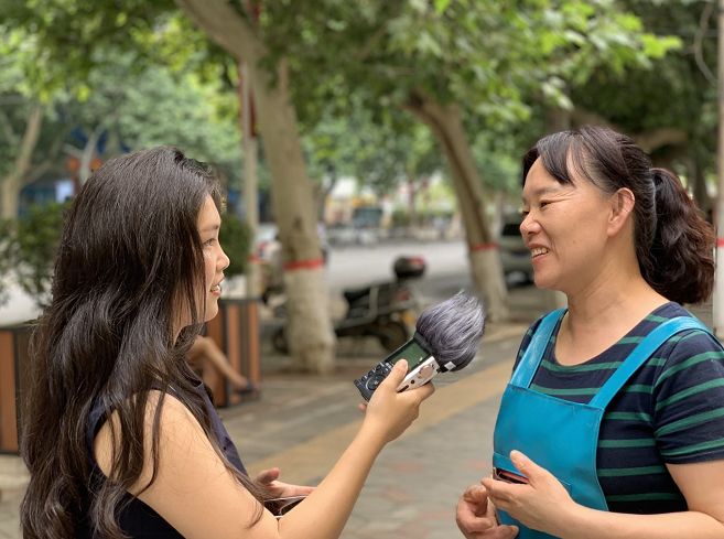 △记者李欣洁采访郑纺机社区附近商户张霞