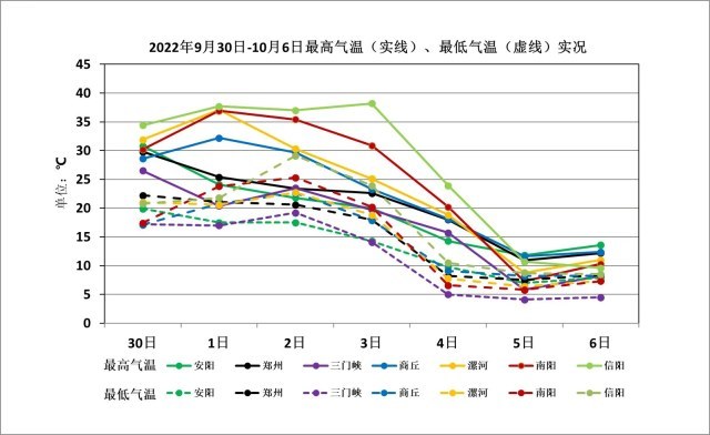 二是气温极端性强,最高气温以及气温下降幅度均突破历史同期极值。受历史同期罕见强盛的西太平洋副热带高压影响,10月1至2日,淮滨、新蔡、固始等累计有71站次日最高气温突破有气象记录以来历史同期极值,创下史上同期最暖记录,其中1日淮滨38.5℃、2日新蔡39.2℃;10月3日下午起,受强冷空气影响,在前期异常偏暖的背景下,我省大部尤其是南部气温呈“断崖式”下降,4日,有26个国家气象站最低气温24小时降幅和10个国家气象站最高气温24小时降幅突破历史同期极值;5日,登封国家气象站最低气温(4.2℃)突破历史同期极值,栾川、登封、灵宝、修武、济源、辉县、渑池局部最低气温降至0℃以下,栾川老君山加密气象站最低降至-2.7℃。国庆假日后期(4-6日)和前期(1-3日)气温相比,可谓“史上最冷遭遇史上最热”,具有罕见的极端性。
