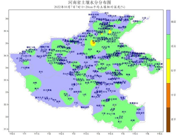 省农业气象服务中心根据多源卫星遥感和自动站土壤水分监测资料分析,10月7日7时全省大部土壤墒情适宜,偏湿比例为51%,干旱站点比例为5%,出现在新乡、安阳个别县(市)。与降水前相比,全省干旱站点比例减少了61个百分点,全省大部地区旱情基本解除,对冬小麦适期足墒播种非常有利。