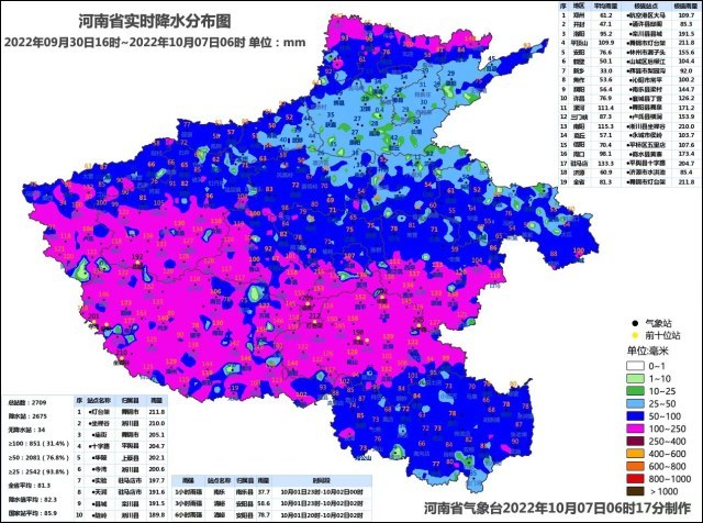 一是降水持续时间长、范围广、累计雨量大,多站24小时降水量突破历史同期极值。在自然降水和人工增雨共同影响下,9月30日16时至10月7日6时,我省自北向南先后出现大范围持续6天左右的降水天气,全省大部累计降水量均在30毫米以上,70%以上的站点超过50毫米,81个县(市、区)共851站达100毫米以上,最大雨量为舞钢市灯台架211.8毫米。濮阳、安阳、周口、驻马店、南阳等地多站24小时降水量突破历史同期极值。5日下午在栾川老君山、西峡老界岭出现短时雨夹雪天气。