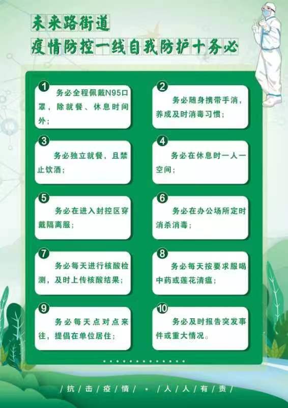 责任体系突出“严”。疫情防控责任是政治责任,防控纪律是政治纪律。未来路街道明确“一办十部”工作责任,建立高效顺畅的体制机制;创新提出“九严格九严禁”纪律要求,明确属地、单位、部门、个人等四方责任;创新制定自我防护“十务必”,强化疫情防控工作纪律,要求街道党员干部、公职人员带头执行;压实社区、楼院、网格主体责任,筑起疫情防控的“铜墙铁壁”。