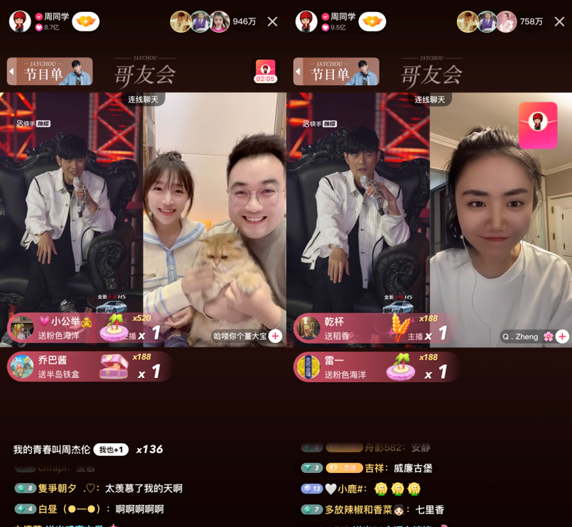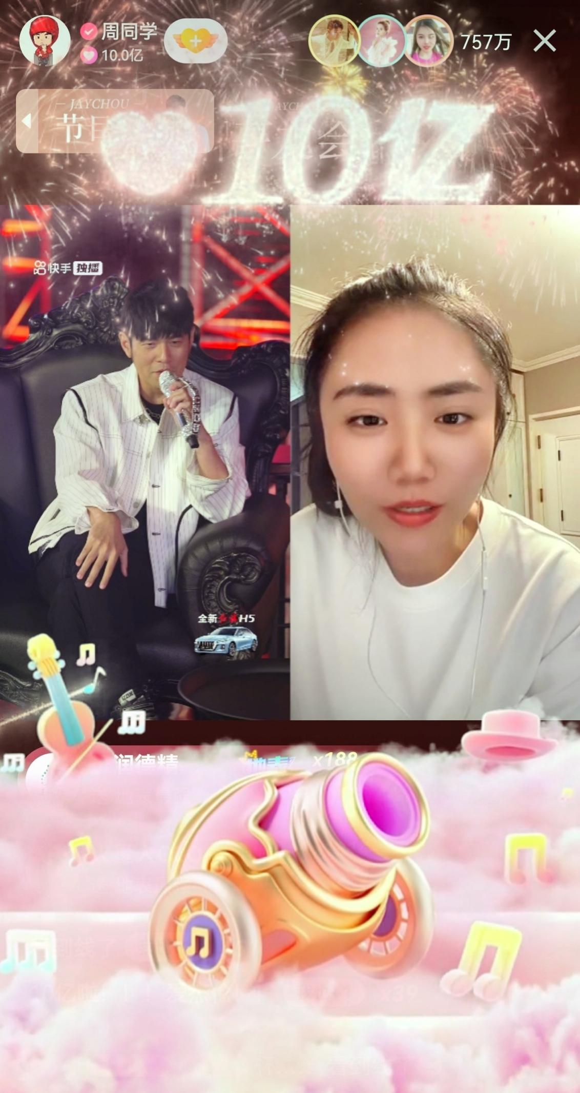 在演唱的同时,周杰伦不忘与粉丝互动,更是临时增加幸运粉丝的连麦名额。其中,快手用户@哈喽你个董大宝与@Q. Zheng最终成为幸运粉丝,与周杰伦现场连麦。因喜爱周杰伦而找到爱情的@哈喽你个董大宝现场背歌词大秀粉丝实力,@Q. Zheng 则带来了魔术表演,互动氛围十分温馨。在直播接近尾声时,看到在评论区留言疯狂点歌的老铁,周杰伦表示,下次有机会再唱给大家听。