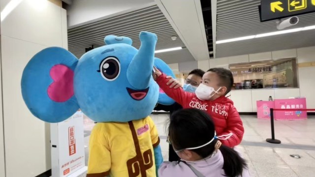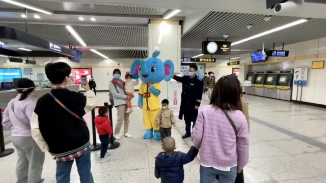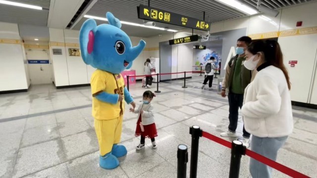 周末天气晴好,很多市民带着小孩外出游玩,郑州地铁关虎屯站员工穿上人偶服装,扮作可爱的“晶晶小象”,为小朋友们留下美好的童年回忆。