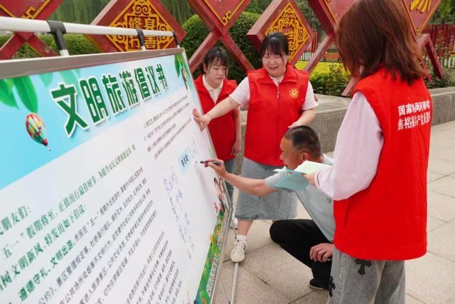 五一假期又逢五四青年节即将来临,中原区税务局的十几名青年志愿者走进康百万庄园,发倡议、讲礼仪、做服务,开展文明旅游宣传活动。“外出旅游不仅能让孩子欣赏风景、学习历史,还能引导孩子在旅游中树立文明的理念。”一位孩子的父亲这样说道。