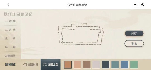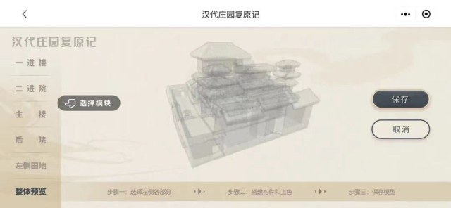 记者在微信里搜索“汉代庄园复原记",进入了这款小程序。在简单的注册、了解文物背景后,即可开始汉代庄园的建筑模型拼搭、涂色等线上互动体验。