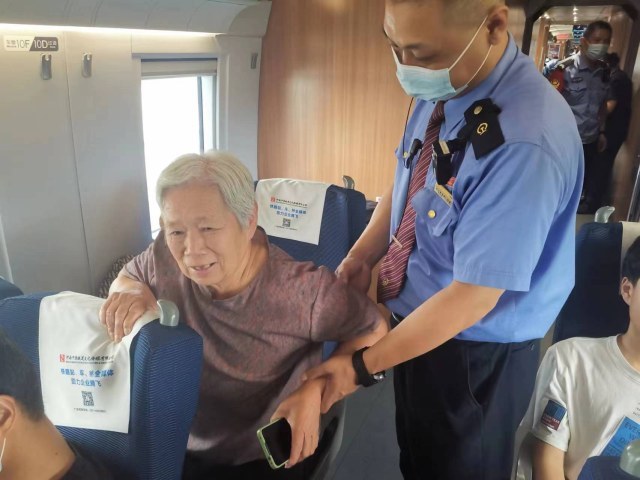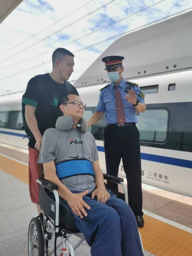 ▲李涛,部队汽车修理工,现任高铁四队深赣6组列车长。(深赣6组列车长李涛为瘫痪旅客服务)