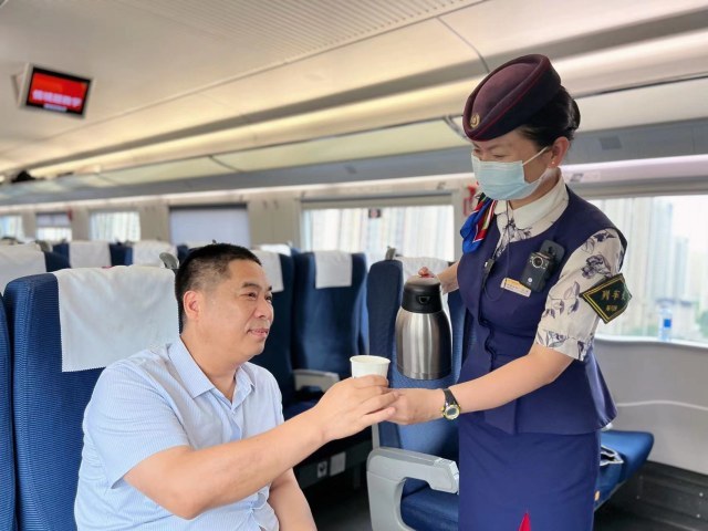 高铁四队的退伍老兵在高铁上继续绽放光彩,他们拒绝躺平,顺势而上,从普铁、动车迈进高铁,见证着高铁乘务的机遇、挑战、奋斗与梦想,高厦5组值乘G2045次列车从郑州东出发一路为旅客提供优质温馨的服务,列车长何鸿磊与车站办理交接流程通畅,保障列车准时准点运行,乘务员陈杨更是用他的服务得到旅客广泛点赞。