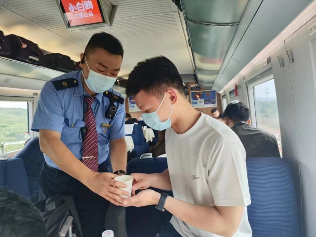 ▲刘峰,武警山东总队枣庄市支队滕州中队,战士,现任高铁四队深南5组列车员。
