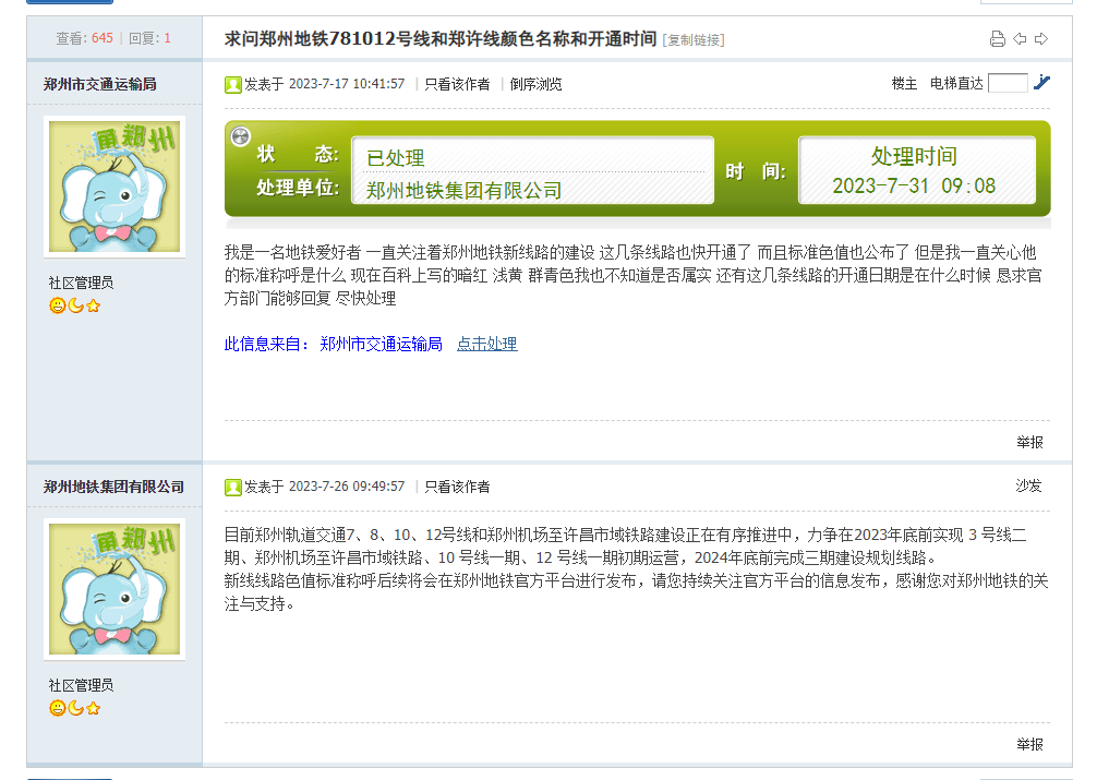 近日,有网友在“心通桥”平台咨询郑州地铁7、8、10、12号线和郑许线的开通时间。