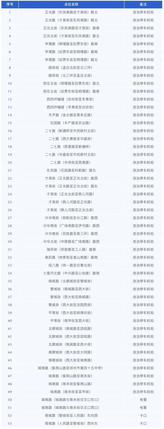 从今天起,郑州交警新启用一批智能电子监控设备,包括违法停车抓拍系统49套、卡口抓拍系统2套、电警抓拍系统2套,主要分布在二七路、兴华南街、城南路等道路。请广大驾驶员注意遵守交通法规,安全文明出行。