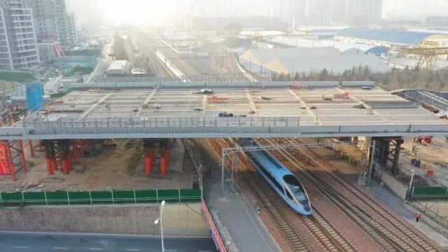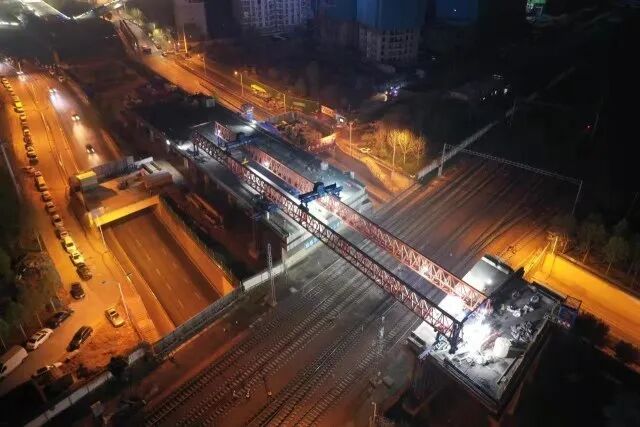 2022年12月30号,彩虹桥上跨京广、郑焦城际铁路钢箱梁顶推顺利完成。↑