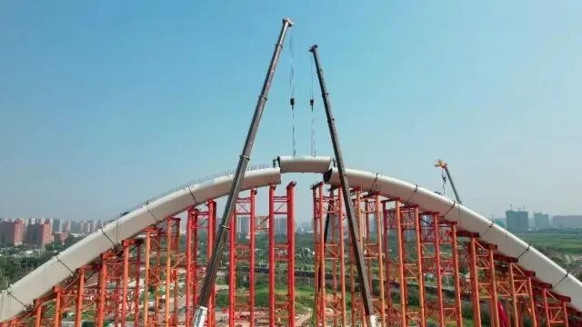 2023年7月18号,新建彩虹桥主桥钢箱拱全部安装完毕。↑