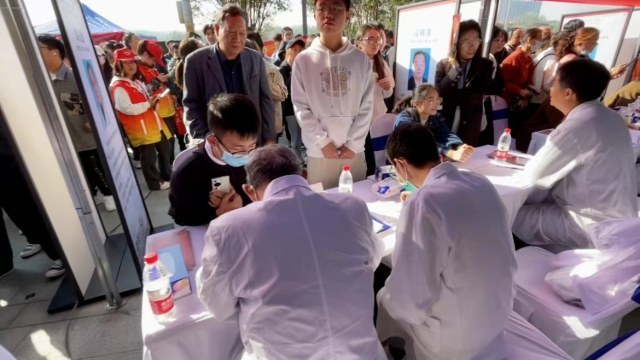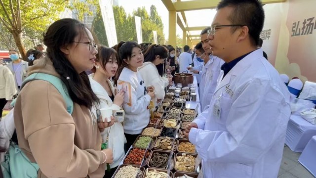 除了义诊之外,活动现场还有中医药文化展示区,同样吸引了大量的群众前去体验针灸、推拿、中医药炮制等项目。在郑州市中医院的展台上,就摆放着八段锦的动作模型,市民扫描旁边的二维码就可以学习,现场负责人杜亚芹:“我们这个还有语音,可以听着语音跟着学习,然后包括药食同源,可以了解这些传统的中医药材。作为中医人,我们也希望通过这次活动给广大市民带来健康,为中医药事业做出我们应有的贡献。”