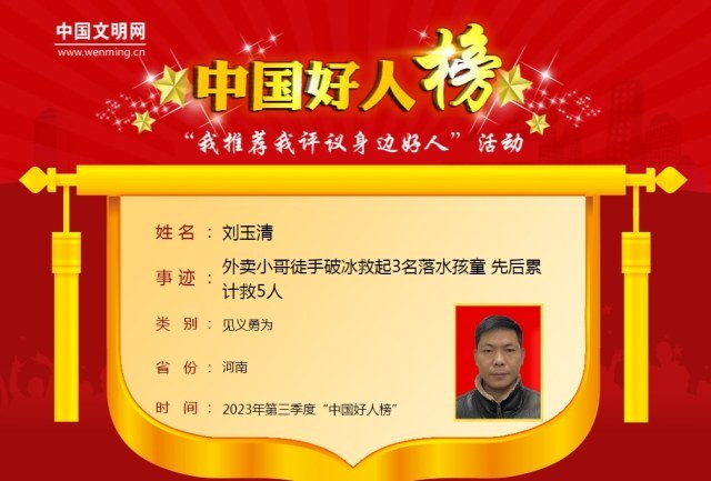 刘玉清是郑州新郑市一名外卖员。2023年1月29日,他正在湖岸边散步,发现湖里三名孩童落水,他不顾个人安危,紧急时刻挺身而出,徒手破冰勇救三名落水者。这不是刘玉清第一次救人。2013年,在北京打工的刘玉清在火灾现场曾救起过一位老人和8个月的宝宝。2007年,刘玉清和路人一起在邙山干渠中将一名落水者尸体打捞到岸边。他见义勇为的事迹登上了央视新闻频道,被中央广电总台中国之声、光明网、河南日报等媒体纷纷点赞。他见义勇为的行为得到新郑市见义勇为评定委员会认定,先后荣获郑州市好市民、新郑市道德模范荣誉称号。