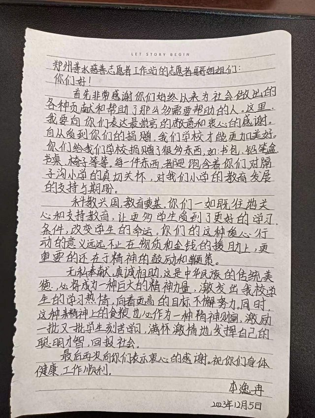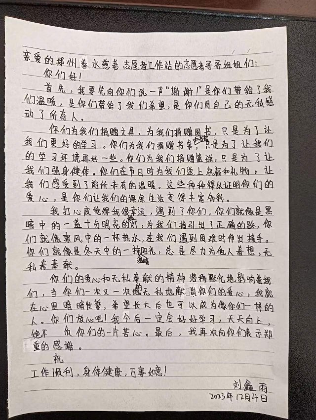 近年来,郑州善水慈善志愿者工作站依托慈善项目和慈善基金为平台,发动社会各界力量,开展丰富多彩的慈善公益活动,积极参与到乡村振兴当中助力乡村教育,受到了帮扶对象的一致好评。郑州善水慈善志愿者工作站负责人苗畬表示,孩子们的书信和贺卡是这个国际志愿者日最好的礼物,他们的认可和满意就是志愿者最大的奖状和荣誉。今后,郑州善水慈善志愿者工作站将继续发扬“奉献 互助 友爱 进步”的志愿精神,以实际行动书写新时代雷锋故事。