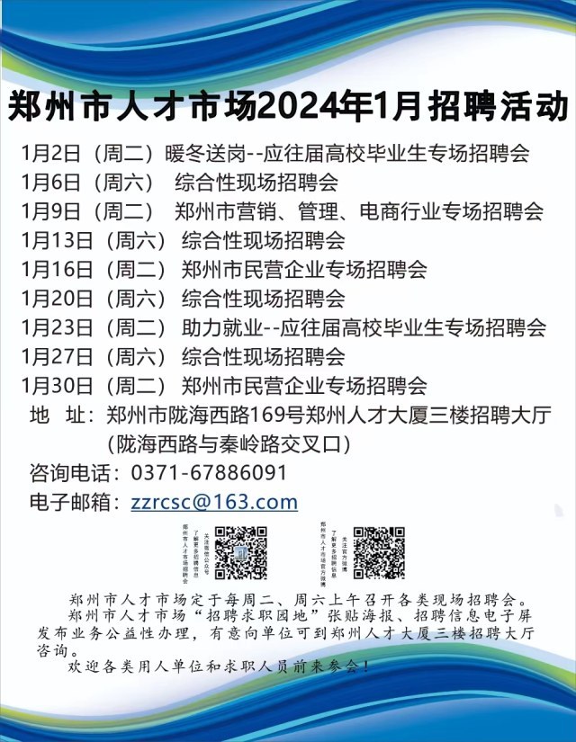 2024年1月,郑州人才市场为求职者准备了9场招聘会,分别是: