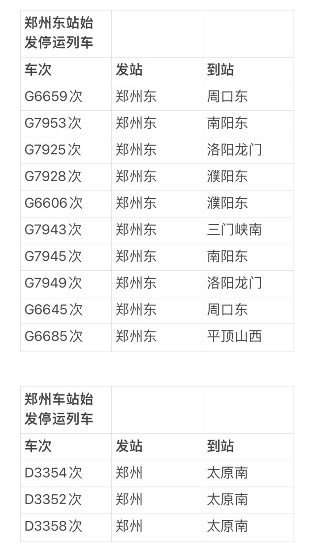 2月1日,记者从郑州站了解到,受中东部地区大范围雨雪冰冻天气影响,为确保旅客出行安全,截至今天早上7点,途经郑州站始发部分列车停运,具体停运列车信息如下: