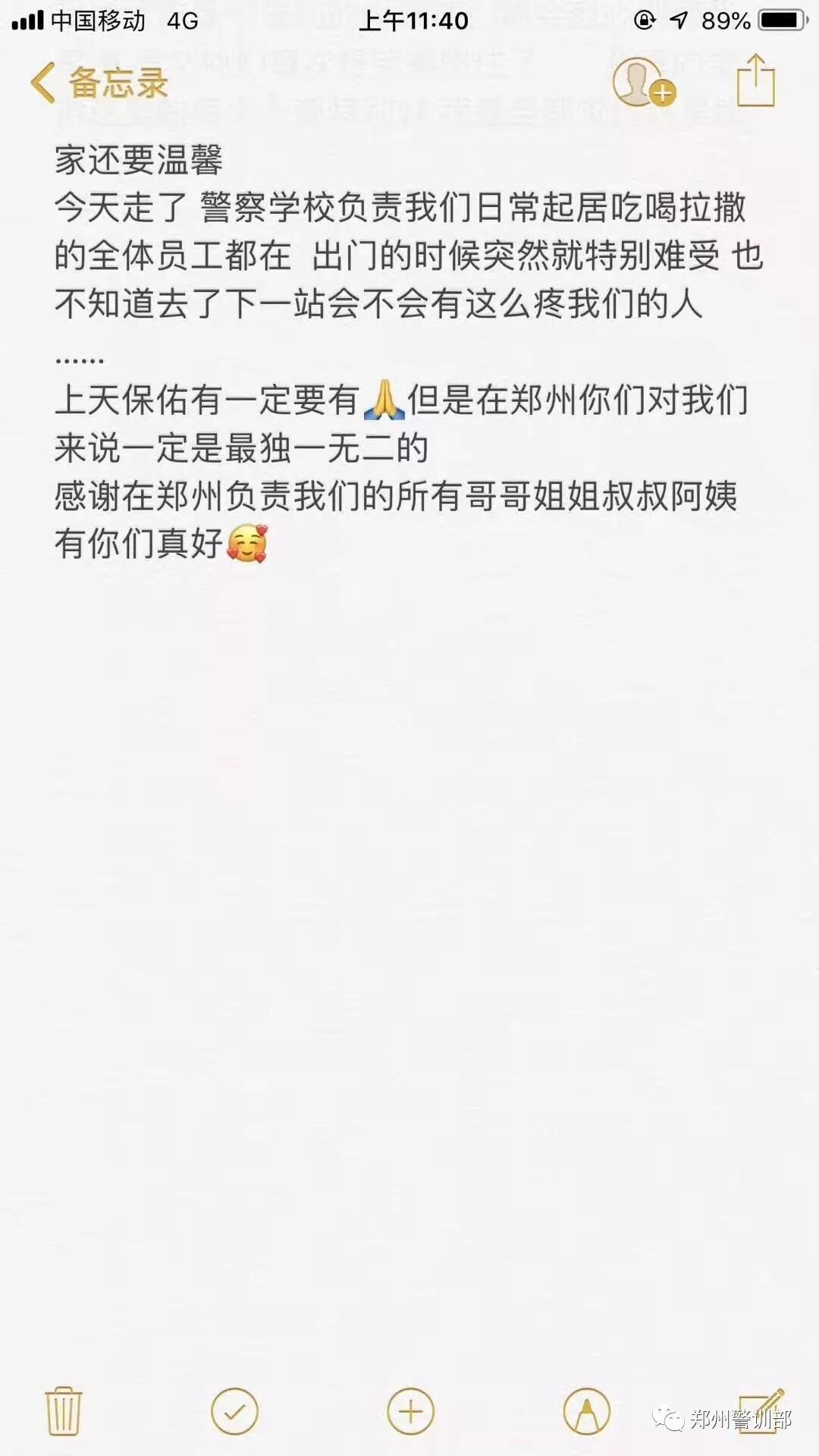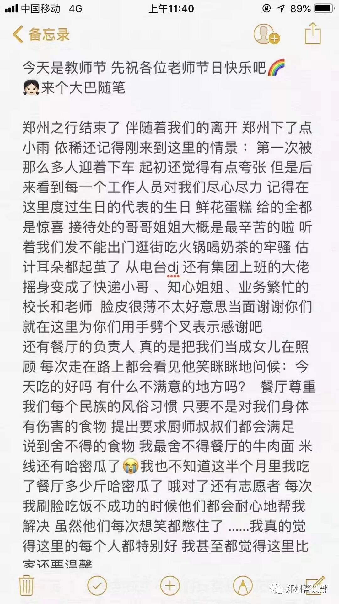 9月10日是56名民族代表离开的日子,参与接待的宾馆管理组和训练部的同志、荥阳市局的安保民警、消防队员、志愿者列队为她们送行。收拾完行装的姑娘们还不忘在小黑板上写着感谢的话,不少的小姑娘们开始悄悄的擦着眼泪。当训练部的领导致欢送辞时说到:“大家在警察训练部共同生活了17天,也意味着警察训练部是你们在郑州的家,希望你们记着我们,常回家看看”时,许多小姑娘在眼眶中打转的眼泪都止不住的落了下来。参与接待的同志中也有不少人落了泪。双方在“伤心”中依依惜别。土家族王静蕾走后发了她写的备忘录,她写道“今天走了,警察学校负责我们日常起居吃喝拉撒的全体员工都在,出门的时候突然就特别难过,也不知道去了下一站会不会有这么疼我们的人,上天保佑有一定要有祝福,但是在郑州你们对我们来说一定是独一无二的。”