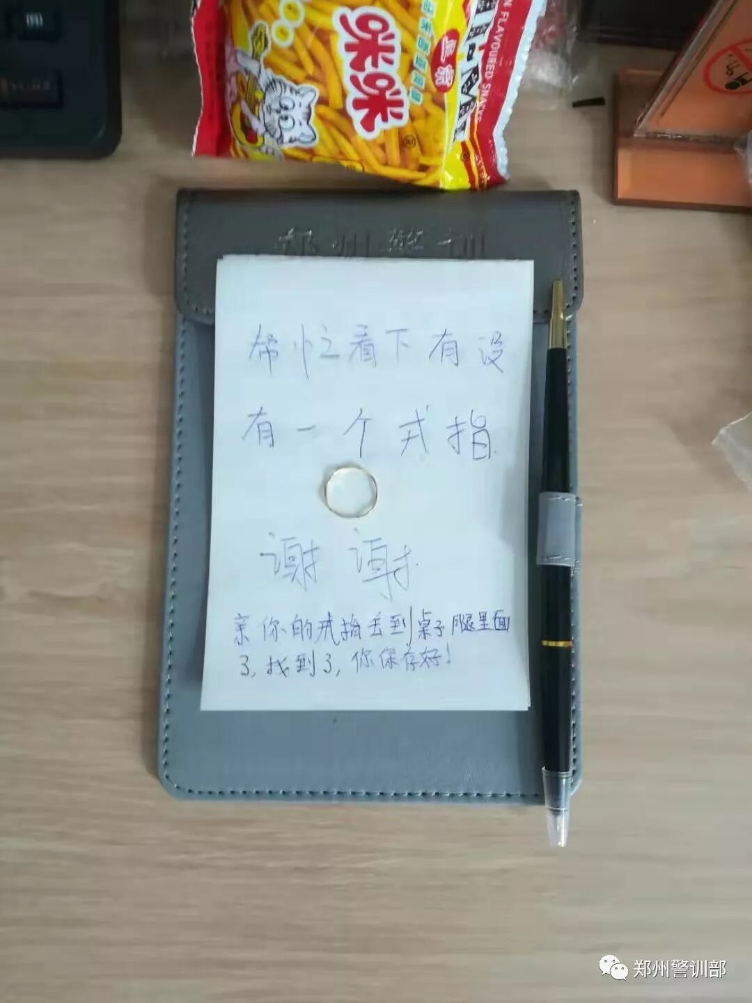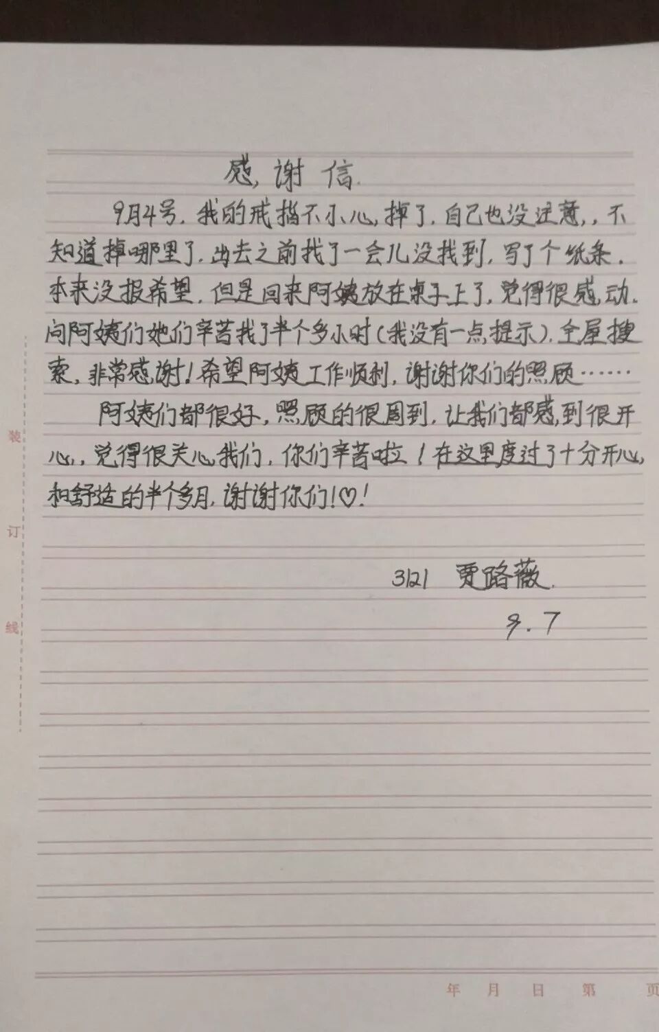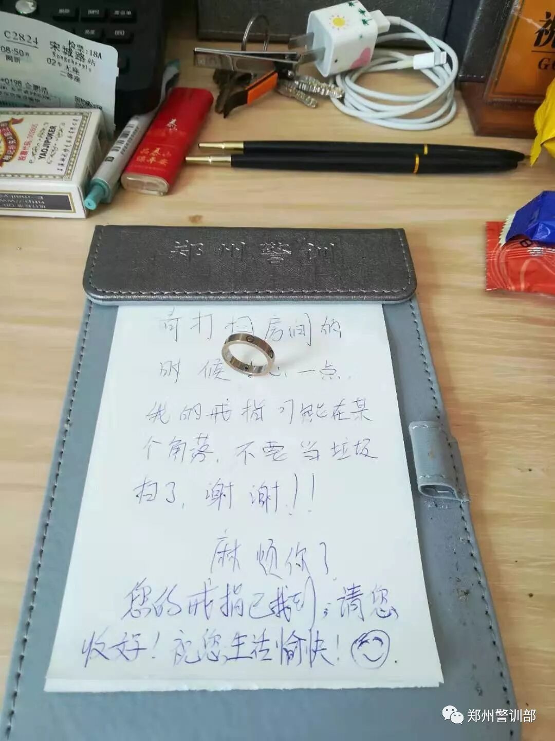 9月4日,河南大学专业演员贾路薇的戒指不知道掉到哪里去了,出门之前找了一会儿没有找到,于是她写了个纸条放在客房桌子上,并没有抱多大的希望。服务员朱晓红、崔丽萍在打扫房间卫生时看到纸条,就帮着她在全屋仔细地找了半个多小时,最后在桌子腿与墙壁的夹缝中找到了,然后放在了房间的桌子上。贾路薇演员回来看到后非常感动,写了表扬信感谢客房的服务员阿姨。
