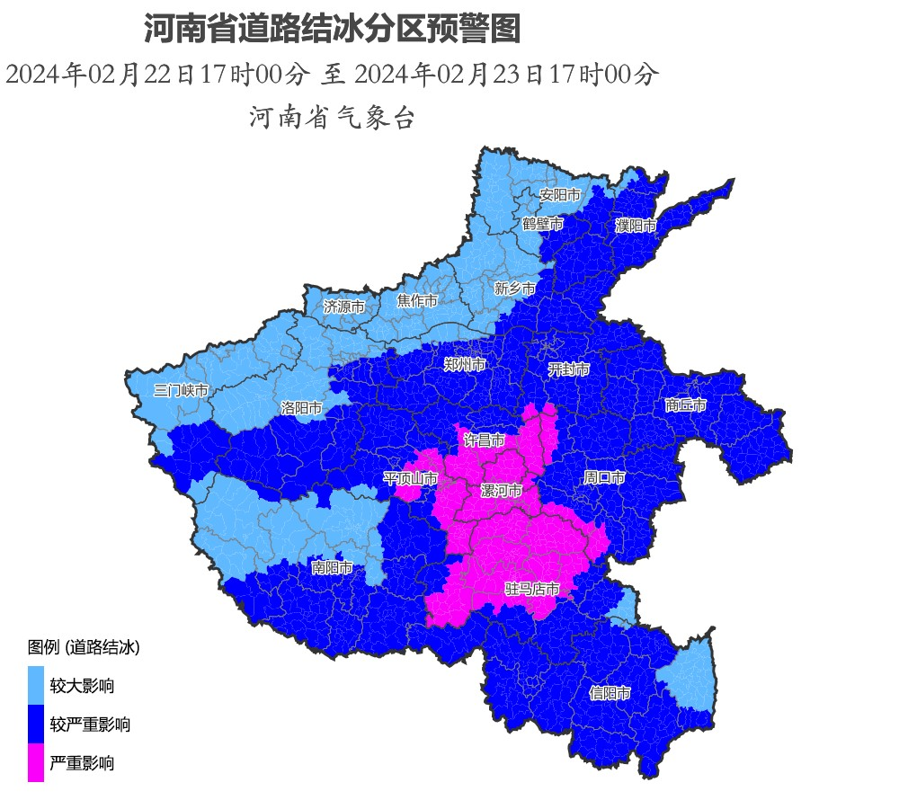 郑州市气象台2024年02月23日17时15分继续发布道路结冰黄色预警信号:受低温和积雪影响,预计今天夜里到明天,郑州市主城区、航空港区、上街区所辖乡镇及街道路表温度低于0℃,将出现对交通有较大影响的道路结冰,请注意防范。