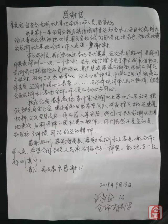 今天是第十一届全国少数民族传统体育运动会在郑东新区龙湖水上基地的最后一个比赛日。几天短短的相处,干净敞亮的环境,贴心周到的服务,给参赛的代表团和报导的媒体朋友留下深刻的印象。海南、贵州、重庆代表团和竞赛裁判组亲手写下感谢信,并为郑东新区龙舟、独竹漂单项竞委会送上锦旗,对竞赛委员会的服务工作给予高度评价。