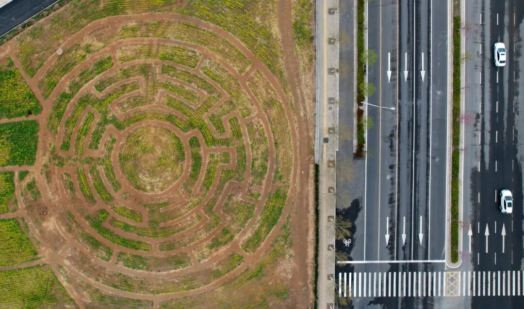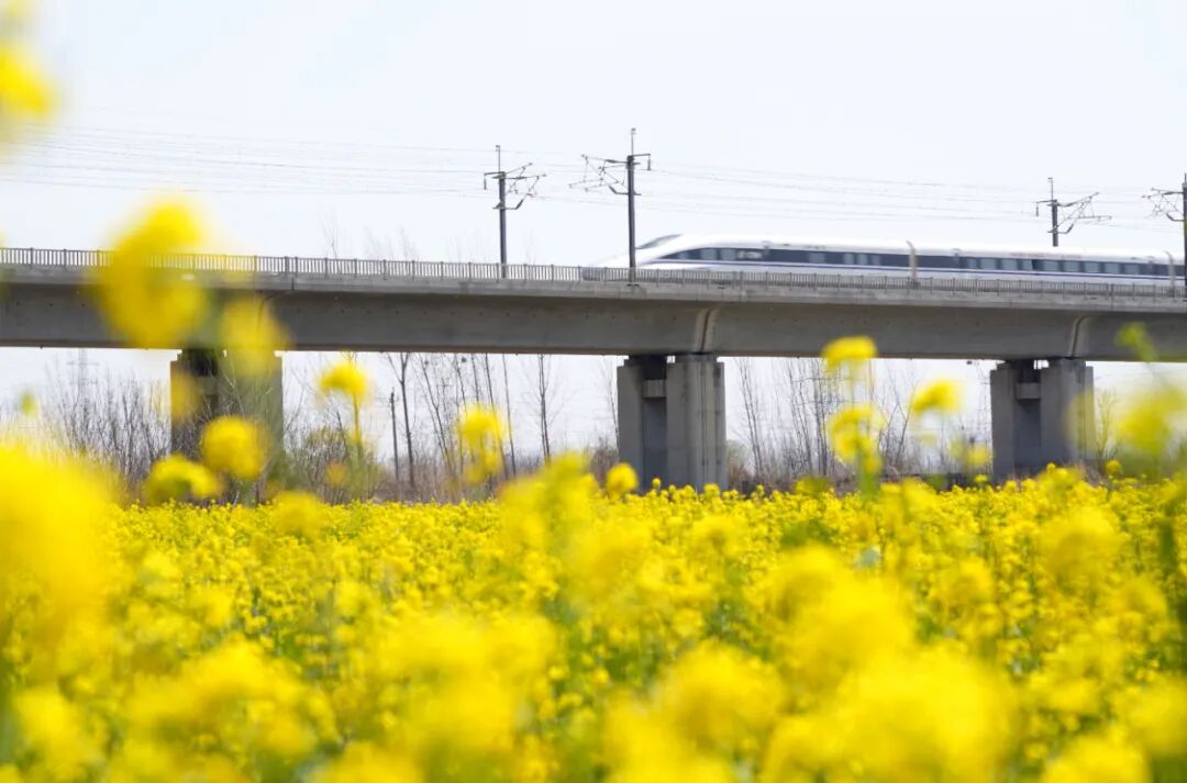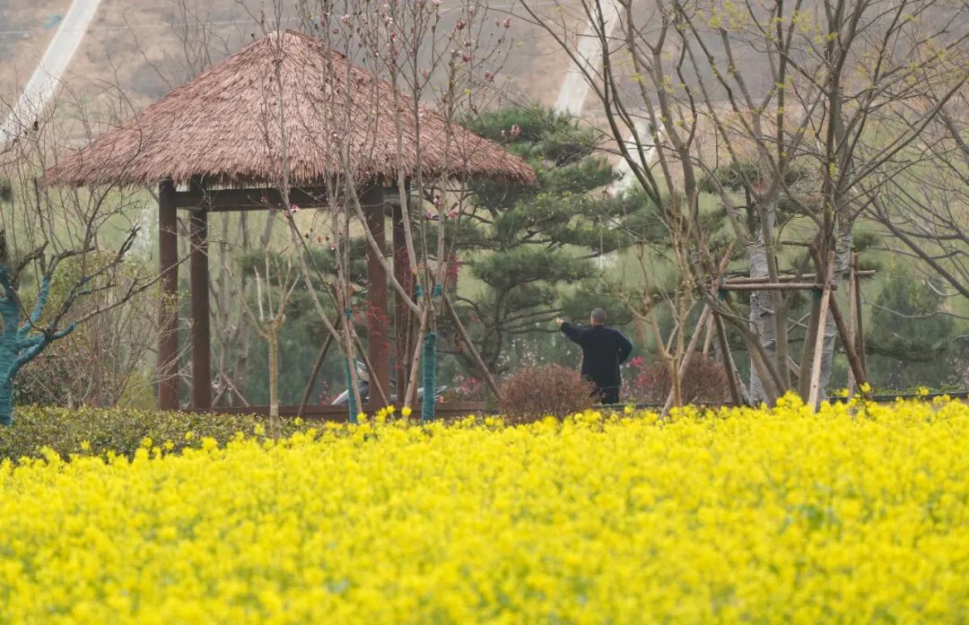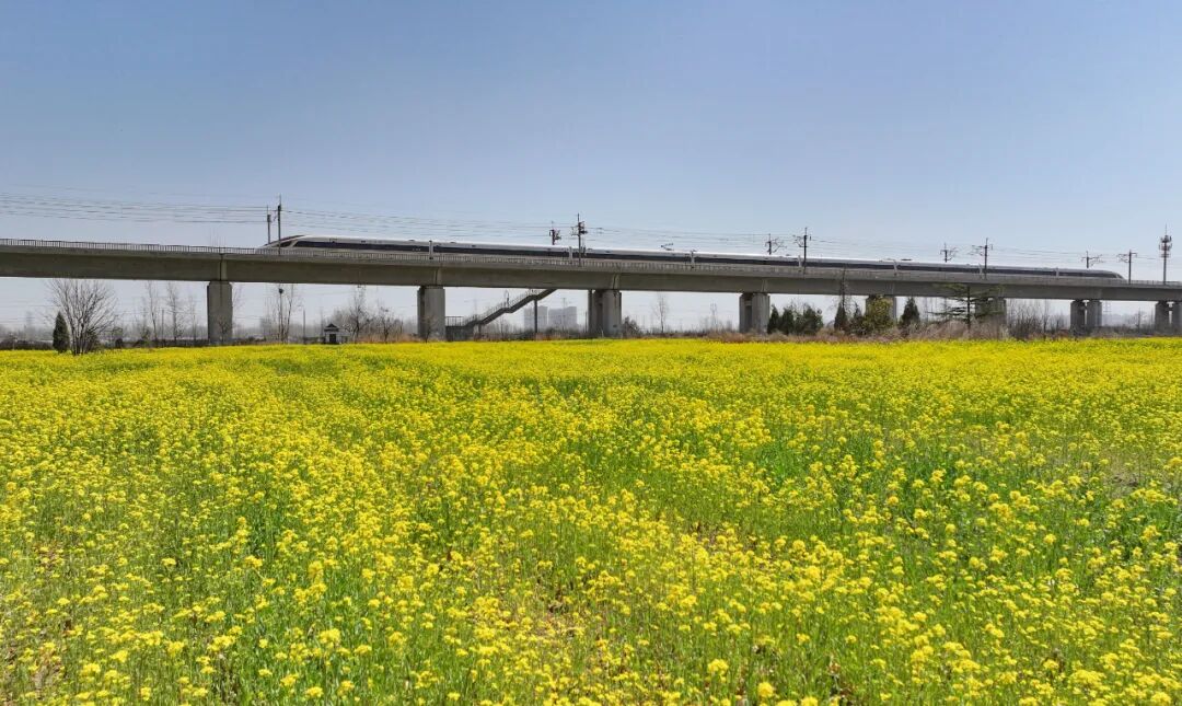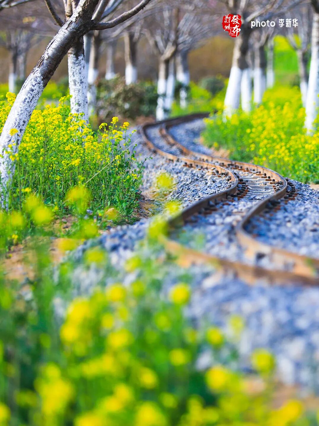 这一大片金黄色油菜花海,距离市区约30分钟车程。窄窄的步道把花海分成田字格,你可以沿着步道深入其中,看花拍照。油菜花田附近还有简单古朴的景观,不远处不时有高铁呼啸而过,勾画出迷人的春日画卷。四周没有高楼遮挡视野打扰,天空开阔,满眼都是透蓝的天、金黄的花、碧绿的秆,超美!