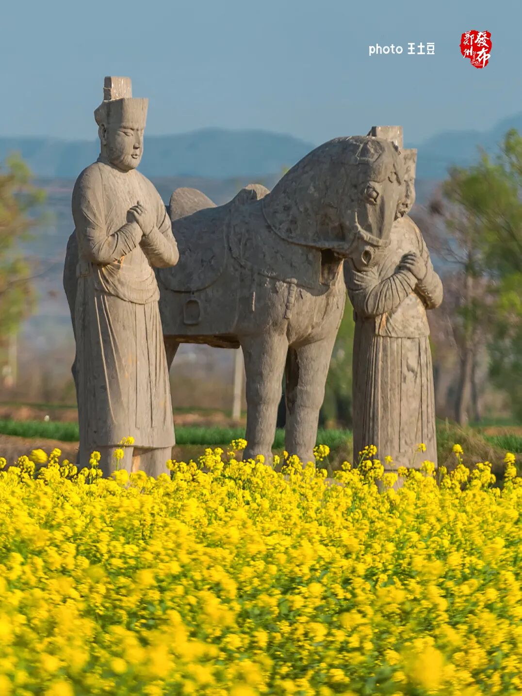 走进位于巩义市芝田镇八陵村北宋皇陵保护区看到,在一片片金黄色的油菜花的映衬下,静默的石像与蓝天白云组成了一幅美丽的春日画面。