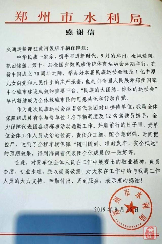 前两天,作为海南代表团对口接待单位的郑州市水利局,给交通运输部发来了感谢信,对赵腾飞等工作人员和驾驶员的工作提出了表扬和感谢!