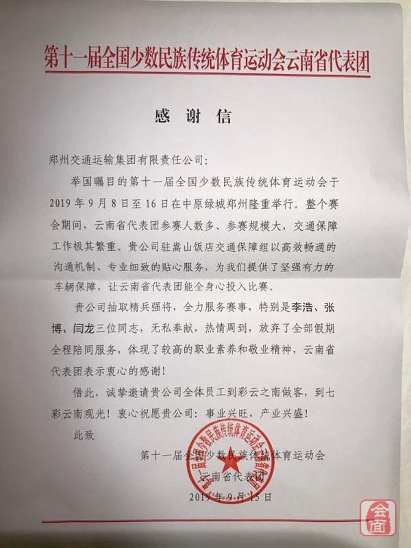 感谢信中,云南代表团对运输保障小组成员闫龙、李浩、张博三位同志提出了高度评价,对他们在赛事期间无私奉献,热情周到的服务表示衷心的感谢,并诚邀他们到彩云之南做客、观光。